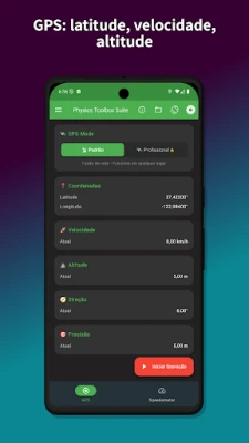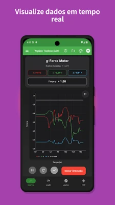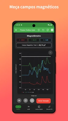 Aprofunde-se na cinemática com medidores de Força G, acelerômetros lineares e giroscópios que mapeiam cada deslocamento e rotação. Explore o universo da acústica com medidores de som, detectores e geradores de tom, visualizando ondas e espectros sonoros com o osciloscópio e o analisador FFT. Ilumine seu estudo com um luxímetro, detector e gerador de cores, além de um sensor de proximidade e um estroboscópio (beta). No reino do magnetismo, utilize a bússola e o magnetômetro, e visualize campos magnéticos em realidade aumentada com o Magna-AR. CINEMÁTICA também integra barômetro, régua, GPS e monitor de temperatura do sistema para uma análise ambiental completa.